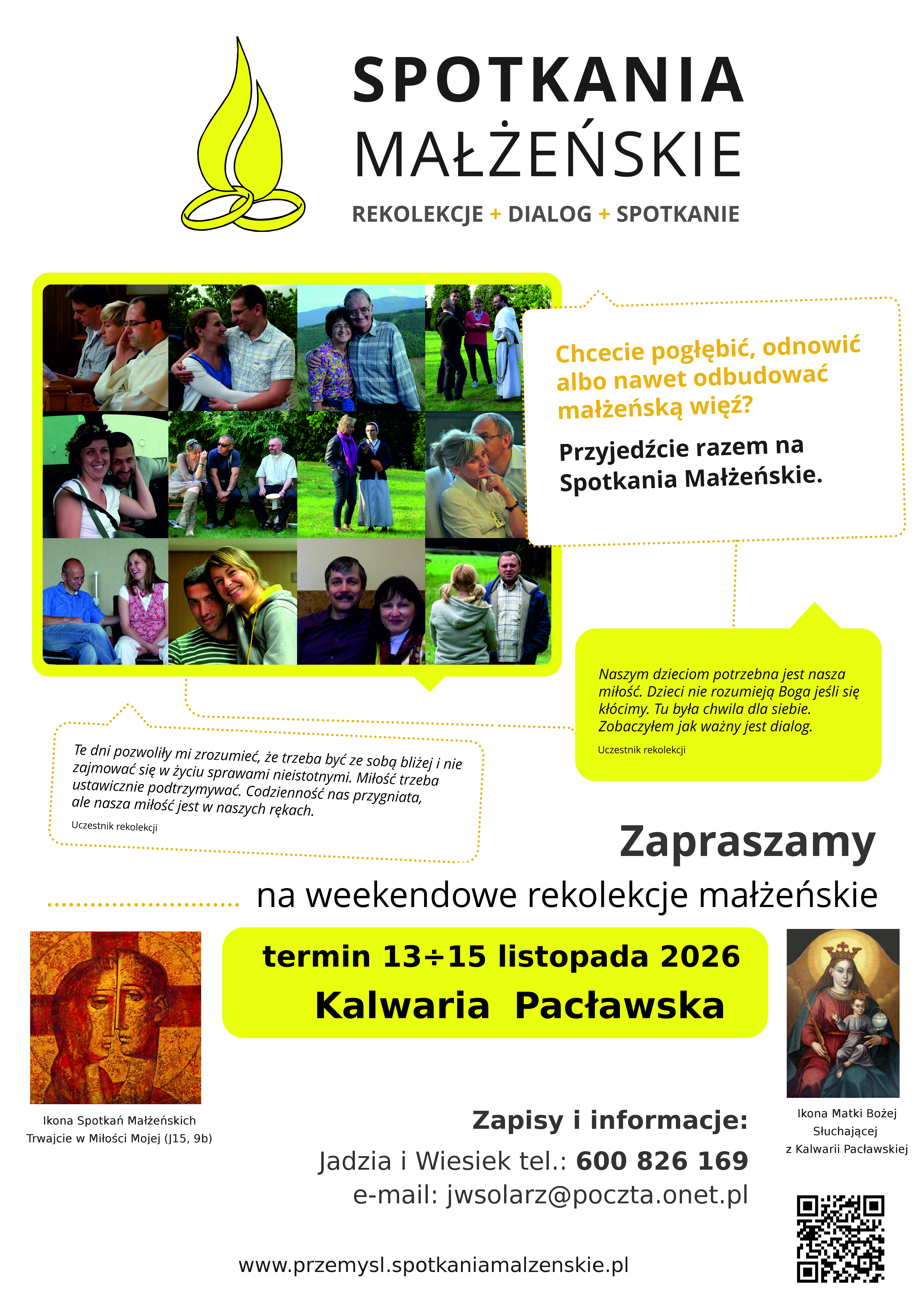 Dlatego zapraszamy Was na prowadzone metodą DIALOGU męża i żony Rekolekcje Weekendowe dla Małżeństw, które odbędą się Sanktuarium Matki Bożej w Kalwarii Pacławskiej.